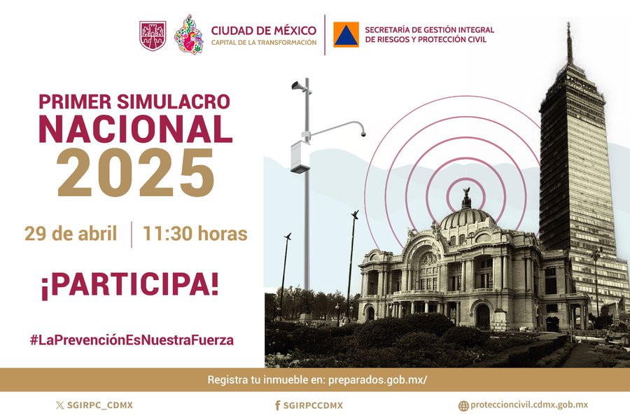Con el fin de promover la cultura de Protección Civil entre la población y fortalecer la capacidad de respuesta de las unidades internas y sus brigadas ante posibles emergencias o desastres, el Gobierno de México, a través de la Secretaría de Seguridad y Protección Ciudadana y la Coordinación Nacional de Protección Civil, invita a instituciones públicas y privadas de todo el país a participar en el 1er Simulacro Nacional 2025, que se llevará a cabo el 29 de abril a las 11:30 horas.