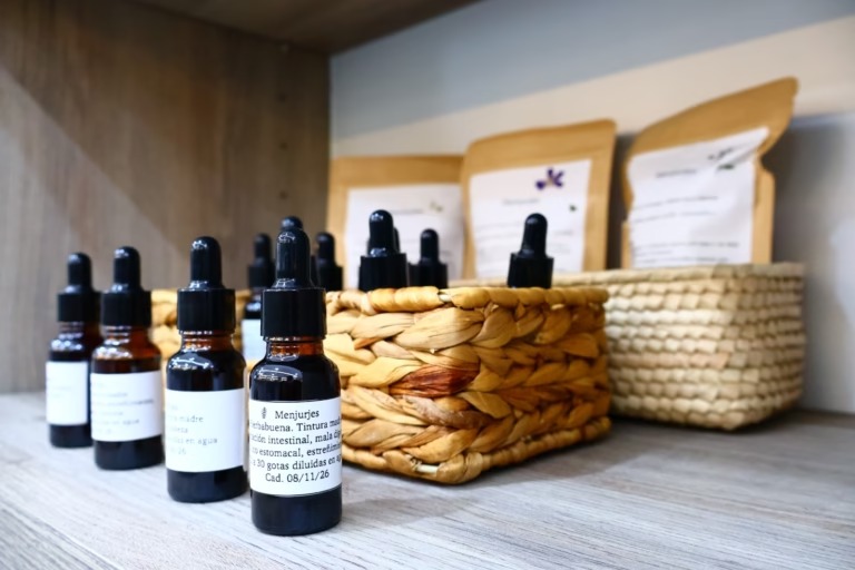 En Essenzia, se ofrece tinturas elaboradas por Menjurjes, una iniciativa de huertos urbanos donde se cultivan plantas medicinales de forma sostenible, sin agroquímicos, respetando los tiempos de la naturaleza y cuidando el entorno.