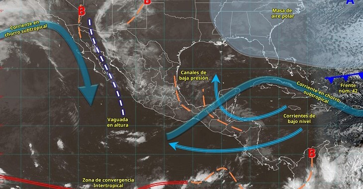 Para este lunes 30 de marzo de 2026, se pronostica que una circulación de baja presión en niveles medios de la atmósfera, junto con una vaguada en altura que avanzará sobre el occidente y el norte de México, interactúe con diversos canales de baja presión en el interior del territorio nacional y con la corriente en chorro subtropical. Esta combinación de sistemas favorecerá la presencia de chubascos y lluvias fuertes acompañadas de descargas eléctricas, rachas de viento y un descenso en las temperaturas en regiones del oriente, sur y sureste del país, incluyendo la península de Yucatán.