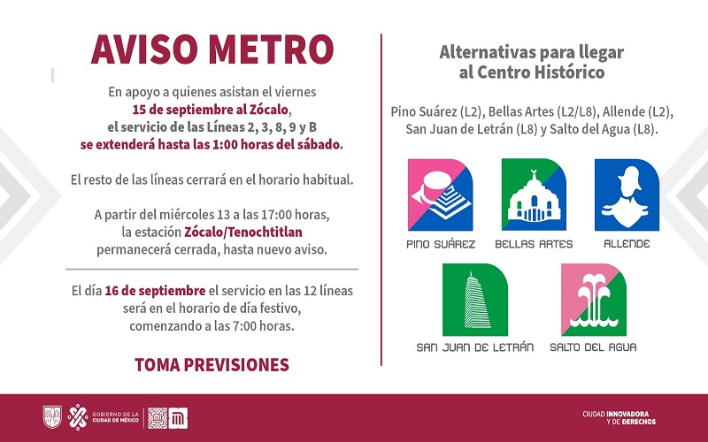 También recordó a sus usuarios que hoy 15 de septiembre el servicio se extenderá hasta la 1:00 horas del sábado 16, en las líneas 2, 3, 8, 9 y B.