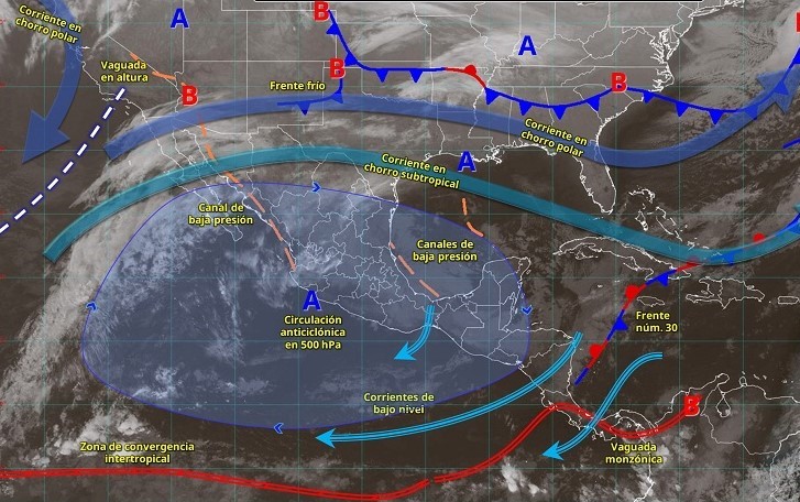 En contraste, una circulación anticiclónica en niveles medios de la atmósfera mantendrá condiciones estables y sin precipitaciones en el occidente, centro y sur de México.