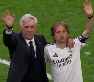 El centrocampista croata Luka Modric y el técnico italiano Carlo Ancelotti fueron reconocidos tras disputar su último...