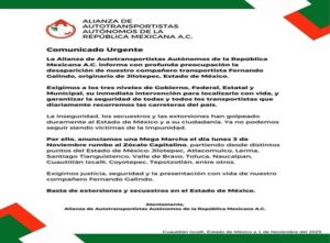 La Alianza de Autotransportistas Autónomos de la República Mexicana (AAARM) denunció la desaparición de Fernando Galindo, transportista...