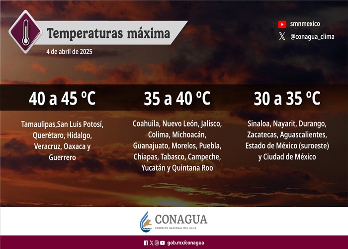 Se anticipan temperaturas máximas de entre 40 y 45 °C en Tamaulipas, San Luis Potosí, norte de Querétaro, norte de Hidalgo, Veracruz, Oaxaca y Guerrero; de 35 a 40 °C en Coahuila, Nuevo León, Jalisco, Colima, Michoacán, Guanajuato, Morelos, Puebla, Chiapas, Tabasco, Campeche, Yucatán y Quintana Roo, y de 30 a 35 °C en Sinaloa, Nayarit, Durango, Zacatecas, Aguascalientes, suroeste del Estado de México y Ciudad de México.