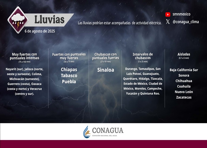 El paso de la onda tropical número 20 por el sur del país, sumado a una zona de baja presión con potencial ciclónico frente a las costas de Oaxaca y Guerrero, así como un canal de baja presión en el sureste mexicano, favorecerá lluvias intensas en Guerrero, Oaxaca y Veracruz. También se esperan precipitaciones muy fuertes en regiones de Chiapas, Tabasco y Puebla, acompañadas de rachas de viento significativas y oleaje elevado a lo largo del litoral de Chiapas, Oaxaca y Guerrero.