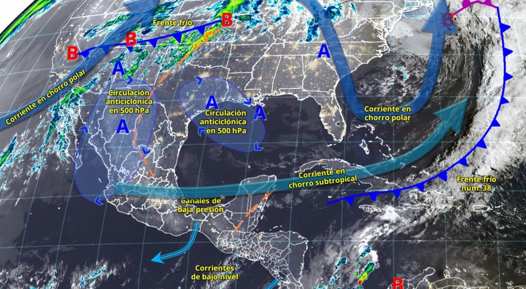 Por otro lado, una circulación anticiclónica en niveles medios de la atmósfera, junto con un bajo contenido de humedad, mantendrá el potencial de lluvias muy limitado, favoreciendo un ambiente cálido a muy caluroso por la tarde en gran parte del territorio nacional. Se pronostican temperaturas máximas de entre 40 y 45 °C en regiones de Sonora, el suroeste de Chihuahua, el occidente de Durango, así como en Sinaloa y Guerrero.