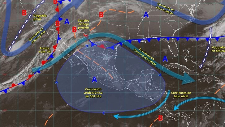 Por otro lado, un sistema anticiclónico en niveles medios de la atmósfera mantendrá condiciones estables, con ambiente cálido a caluroso en la mayor parte del país.