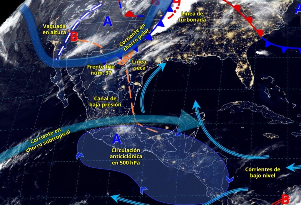 Un nuevo frente frío, el número 37 la llegada del frente frío número 37, se ubicará en el norte del país y se combinará con una línea seca, una vaguada en altura y la corriente en chorro polar. Como resultado, se esperan vientos muy fuertes a intensos en las regiones noroeste y norte, con ráfagas que podrían alcanzar hasta 120 km/h en Chihuahua y Durango.