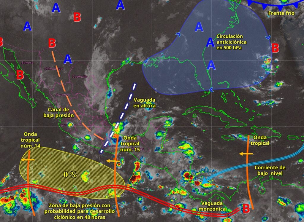 La onda tropical número 15, en combinación con una vaguada en altura y el ingreso de humedad tanto del Golfo de México como del Pacífico, será responsable de lluvias intensas en Oaxaca, Veracruz y Puebla, así como precipitaciones muy fuertes en Hidalgo, Guerrero y San Luis Potosí. Además, se esperan lluvias fuertes en Tlaxcala, Morelos, Ciudad de México, Estado de México, Querétaro y Tamaulipas; chubascos en Guanajuato, Zacatecas, Coahuila y Nuevo León; y lluvias ligeras en Sonora y Aguascalientes.