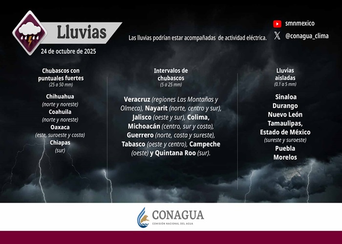 Chubascos con lluvias fuertes (25 a 50 mm): Chihuahua, Coahuila, Michoacán, Guerrero, Oaxaca y Chiapas.