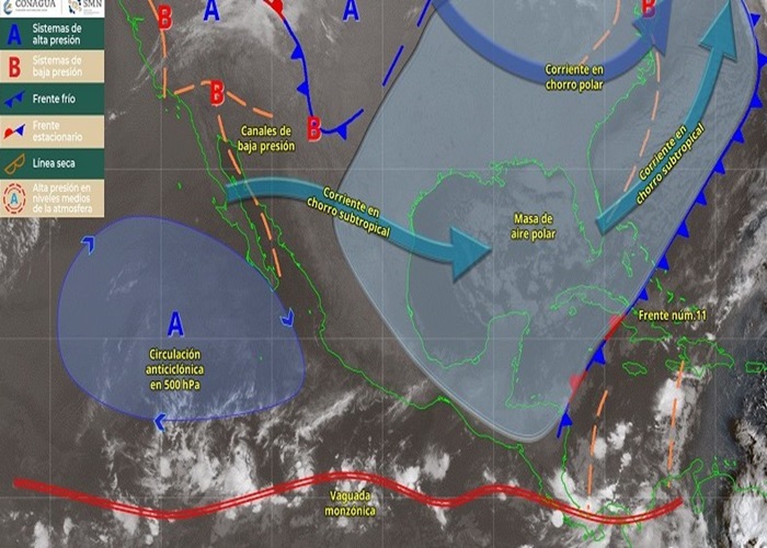Asimismo, continuarán los vientos del componente norte con rachas de entre 55 y 70 km/h en el Istmo y Golfo de Tehuantepec, Oaxaca, aunque se espera que esta condición disminuya hacia el final del día.