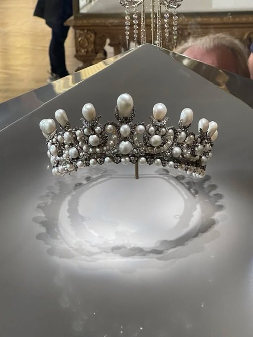 -La tiara de perlas de la emperatriz y el Gran Lazo del Corpiño, ambos ejemplos de la alta joyería parisina del siglo XIX.