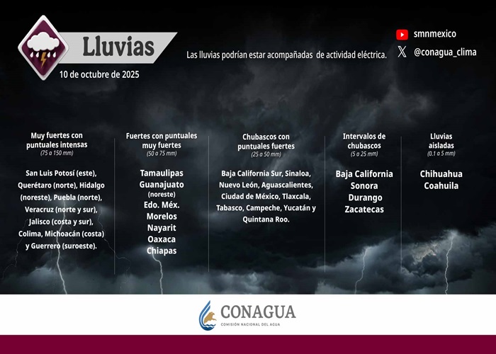 El temporal de lluvias continuará afectando gran parte del territorio nacional, con precipitaciones muy fuertes a intensas en el noreste, oriente y sureste del país, así como en el centro y la península de Yucatán.