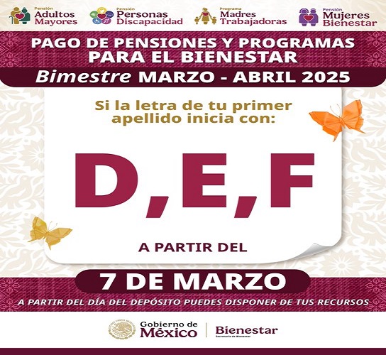 Las personas con apellidos que inicien con la letra D, E y F podrán acceder a los recursos de las Pensiones para el Bienestar y Madres Trabajadoras, correspondientes al bimestre marzo-abril de este año.